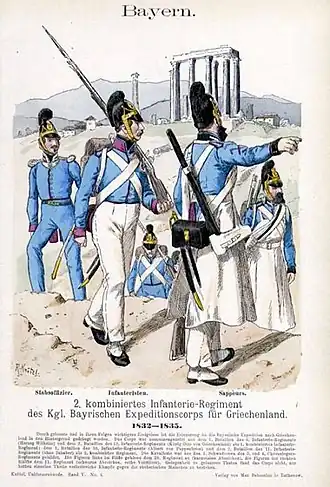 Most of the Bavarian Army regulars left Greece after a year, and were replaced by volunteers.[17] Between 1832 and 1835, 5,410 volunteers were recruited for the Corps. 3,345 were Bavarians, 1,440 from minor German states, 235 Swiss, 186 Prussians, 135 Austrians, 23 French, 19 Danes, 10 Russians, 6 Italians, 3 Swedes, 2 British, 1 each from Holland, Spain, and Belgium, and even 3 Turks.[18]