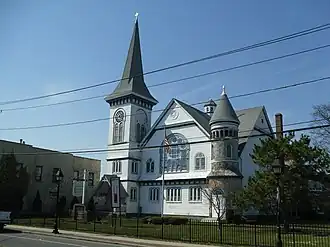 Bay Shore Methodist Episcopal Church, also known as the United Methodist Church of Bay Shore, is a historic Methodist Episcopal church complex at E. Main Street at the junction of Second Avenue in Bay Shore, Suffolk County, New York. The complex consists of three attached units: the 1893 Richardsonian Romanesque-style church; the Gothic Revival style former church building built in 1867, relocated and now attached to the main church as the "Fellowship Hall," and a two-story, flat roofed Sunday School wing built in 1959.[2]