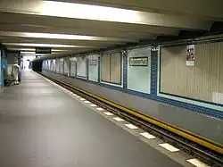 The lower-level U7 portion of the station, built to Rainer G. Rümmler's design in 1968–70 and opened in 1971, also makes use of the Bavarian colours: the walls are clad in blue fibre cement panels with the station name on a white horizontal stripe, and the support columns are white.[8] The ceiling, resembling skylights in industrial buildings, was designed to avoid dazzling train operators;[9] the fluorescent lights are inset in red piping.[8] The lobbies are decorated in contrasting colours: white, red and turquoise. The design resembles that at Eisenacher Straße, also by Rümmler.[9]