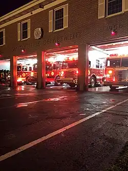 The Bayport Fire Department was organized on August 15, 1891, with 18 members under the name Bayport Hose Company. Charles R. Post was made Chief.[6] A plot of land on the north side of Middle Road, next to Shands (Little Albert's) was purchased from I. S. Snedecor for $500 and a Fire House built for $3000. There was a belfry but this was removed in 1941. This building was sold to Arthur Shand, and a new firehouse was built on Snedecor Avenue and Railroad Street in 1956 where it stands today. In 1896 they bought a hook and ladder truck so heavy that there were not enough members to pull it to the fire. This also created the Hook and Ladder Company thus changing the name to the Bayport Fire Department.