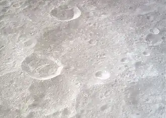 ![]() Oblique view of Bečvář from Apollo 17, facing north. Bečvář X is at top near center, Bečvář Q is below left of center, and Bečvář J is partially visible in lower right. | |