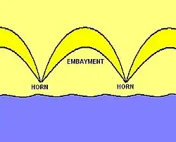 The first is that positive feedback between the morphology of the beach and the flow of the water creates relief patterns. On a flat beach, surface areas will develop with a slightly lower relief than their surroundings. Areas with lower relief attract and accelerate water particles, which means they have more energy and the area is eroded further. Through positive feedback, the area becomes more and more eroded, and this creates the embayment. The development of these areas of lower relief causes mean beach level to be lowered and so areas that were initially on the level are now below the average and as such, are now areas of higher relief. Areas of higher relief slow the water down and sediment is deposited on top of them, which increases their impact. This creates the horns.