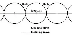 The antinodal point is where all the movement takes place as the water rises and falls, creating a series of peaks and troughs. Between these antinodal points are the nodal points where no vertical movement takes place. An incoming wave has an almost uniform height but when it collides with a standing edge wave, this is changed. If it collides with a peak, then the wave height is increased and if it collides with a trough, then its height is decreased. In the adjacent diagram, the two waves cancel each other out, creating a flat surface. However, this is a highly simplified version of events. The incoming wave has the same wave period as the edge wave, so the incoming wave changes from a peak to a trough over the same period as it takes the standing wave to change so they keep the same pattern. These are known as synchronous waves and are very uncommon.