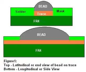 Bead probe technology (BPT) is technique used to provide electrical access (called “nodal access”) to printed circuit board (PCB) circuitry for performing in-circuit testing (ICT).[1][2] It makes use of small beads of solder placed onto the board's traces to allow measuring and controlling of the signals using a test probe. This permits test access to boards on which standard ICT test pads are not feasible due to space constraints.