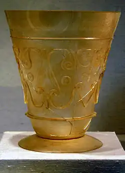 In archaeology, a beaker is a small round ceramic or metal cup, a drinking vessel shaped to be held in the hands. It has no handle or spout, and generally no spreading foot (base).