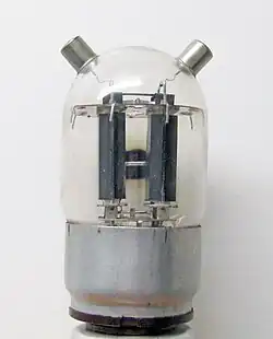 A beam tetrode, sometimes called a beam power tube, is a type of vacuum tube or thermionic valve that has two grids and forms the electron stream from the cathode into multiple partially collimated beams to produce a low potential space charge region between the anode and screen grid to return anode secondary emission electrons to the anode when the anode potential is less than that of the screen grid.[1][2] Beam tetrodes are usually used for power amplification, from audio frequency to radio frequency. The beam tetrode produces greater output power than a triode or pentode with the same anode supply voltage.[3] The first beam tetrode marketed was the Marconi N40, introduced in 1935.[4][5] Beam tetrodes manufactured and used in the 21st century include the 4CX250B, KT66 and variants of the 6L6.