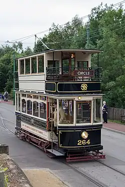 Sheffield 264 was built by the United Electric Car Company of Preston for Sheffield Corporation Tramways, one of a batch of fifteen double-decker open balcony cars delivered in 1907. It was built with wooden seats for 54 passengers, mounted on a 4-wheel Peckham P22 truck with two Metrovick 102DR 60 hp motors using BTH B510 controllers, with braking systems being a handbrake acting on all wheels, an electric brake for emergency use and a hand-wheel operated track brake. A 1926 rebuild included modification to a fully enclosed upper deck. Displaced to peak hour use in the 1930s, it was renumbered 342, but was not withdrawn until 1956.[29]