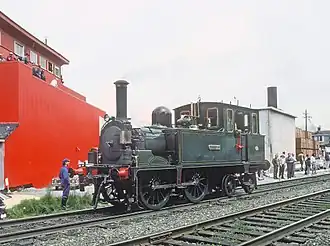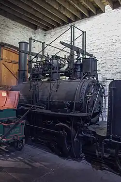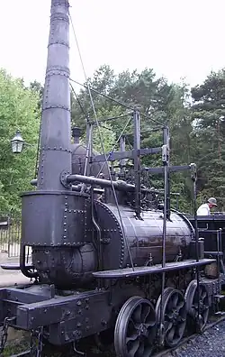 Locomotion No. 1 is a replica of an original locomotive which was designed by George Stephenson and built in 1825 for the Stockton and Darlington Railway, which made it the first steam locomotive to carry passengers on a public rail line. The Beamish replica was completed in 1975 for the 150th anniversary of the S&DR. The original survives as a static exhibit, having eventually become part of the National Collection held by the National Railway Museum, who have placed it on long-term loan to Head of Steam (a museum on the route of the S&DR).[6][7] This locomotive is currently out of use as its boiler certificate has expired. It is currently on static display at the National Railway Museum Shildon and is awaiting overhaul.