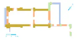 The contemporary nave was built at the end of the 11th or beginning of the 13th century, a hypothesis based on the correspondence between written sources and the architectural style of the capitals.[61] It comprises three bays of slightly differing lengths, punctuated by exterior buttresses. At least one additional bay would have extended it to the west,[61] but in its current configuration, it is 18 m long and less than 8 m wide.[62] The gutter walls are just under a metre thick, except in the southernmost bay, where they are 1.20 m thick; this disparity is not explained.[63] The masonry of the walls is a blend of the original regular medium-structure and irregular rubble stone from the restoration campaigns that lasted until the 20th century.[64] The height of the nave is now divided into three levels and an attic, and the interior of the building has been significantly altered by the construction of new wooden floors and dividing walls. However, examination of the vaults confirms that the nave must have extended to the west and east.[65]