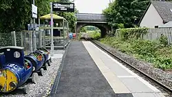 Following a local campaign, the station was reopened on 15 April 2002.[4] A new single platform, shelter and car park were built in a £250,000 project.[12] The platform is the shortest in Great Britain: at the length of 15.06 metres (49 ft 5 in),[13] it is shorter than a single carriage of a Class 158 train that is usually used on this line. The platform's length only allows for a single door on the train to be opened, most frequently it is the frontmost door.