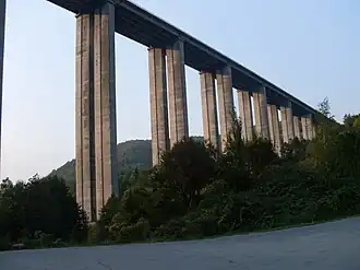Bebresh Viaduct (виадукт „Бебреш“) is a girder bridge part of the Bulgarian Hemus (or A2) motorway, located in Vitinya Pass in Stara Planina 60 km east of Sofia, at 650 m above sea level. It was opened in 1985 and was designed by the team of D. Dragoev, P. Minchev and Y. Todorov of Moststroy AD.
