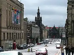 Nevertheless, the building forms an important part of the Old Town's cityscape, terminating the view south along George IV Bridge.[12][40] Two decades prior to the opening of the New North Free Church, Hamilton had, along with William Burn, led the design of civic improvements in the Old Town. Hamilton's plans were not executed in their entirety but they included both the George IV Bridge and the triangular block formed by Teviot Row, Bristo Place, and Forrest Road at whose northern point the Bedlam Theatre now stands.[40]