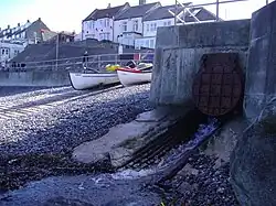 Sheringham watermill began operating in c.1750[4] and was used in the processing of maize. By c.1865 the mill had been converted into a paper mill. The location of the Watermill was in Beeston Road which until 1901 had been called Paper Mill Road. The mill's power came from an overshot waterwheel. Beeston beck is only a small slow running beck and in order to power an overshot waterwheel there would have had to have been a good headwater. A Dam and a millpond would have provided this power but all traces of this engineering works have disappeared over the passing of time. It is believed that the mill pond may have been located on the site of what is now housing and local allotment gardens. A Blue plaque has been placed on the wall of a cottage in Beeston road at the location of the paper mill. The plaque was placed there by Sheringham & District Preservation Society.[5][6] The beck now runs along the rear of these cottages before entering a culvert which runs under Beeston Road and Beach Road and appears at an outflow in the wall of the sea defences on the beach. From there on it runs across the beach and into the North Sea.
