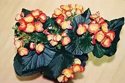 Begonia × hiemalis, the elatior begonia or Reiger begonia, is an artificial hybrid species of flowering plant in the family Begoniaceae.[1] Its parents are Begonia socotrana and Begonia × tuberhybrida (itself a hybrid of multiple species).[2] Hybridization efforts began in 1881, with the first cultivar named 'John Heal'.[1] The 'Elatior' cultivar debuted in 1906, and beginning in 1950 Otto Rieger issued many new, disease-resistant cultivars, such that people began to call the species "elatior" or "Rieger" begonias.[1] In addition to their typically doubled flowers which come in every color except blue, they are valued for their tendency to bloom in fall and winter, and in fact nearly year-round.[1]