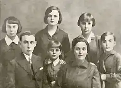 By late 1941 Vilna was also occupied by the Germans, who immediately started murdering the Jewish inhabitants. Hazan worked as a nurse for while in a hospital in the ghetto.[2] Because of her Aryan appearance, Hazan then volunteered to act as a courier (kasharit) for the resistance, carrying messages, money and arms to resistance groups, between the ghettos of Vilna, Grodno, Lida and Bialystok. She adopted the name of a Polish woman that she knew, obtaining her passport, changing the photograph to become Bronislawa Limanowska, an identity she maintained throughout the war. She began wearing a crucifix and attending church regularly. She moved to Grodno, where her room became a meeting place for other couriers of the "Kashariyot". She obtained a job with the Gestapo as an interpreter, allowing her to steal documents and stationery that she passed on to the resistance.[1] She was invited by one of the Gestapo officers to their Christmas party in 1941. On explaining that she had two friends staying with her, she was urged to bring them too. While at the party, one of the Gestapo officers took a picture of the three of them, Hazan, Tema Sznajderman and Lonka Korzybrodska, all three of them young Jewish women part of the Kashariyot, living with assumed Polish identities.[3]