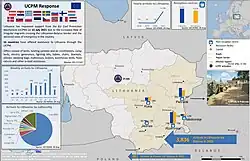 In the meantime, in early July, Lithuania announced a plan to build a border barrier to stem the flow of illegal crossings.[120] On 5 August 2021, the chief of the Lithuanian State Border Guard Service presented a project of the proposed barrier for the entire Belarus-Lithuania border which would be 4 m (13 ft) high and would use multiple layers of the Concertina wire.[121] The cost of the project is estimated at €150 million and the Lithuanian parliament approved it as a matter of urgency. Other countries and institutions sent reinforcements to assist with the surge. On 24 July, Estonia sent 100 km of barbed wire to help Lithuania to build the border barrier and three drones for the Lithuanian border guards.[122] Non-EU member Ukraine also sent more than 38 tonnes of barbed wire to Lithuania.[123] Meanwhile, by the end of July, EU Frontex deployed 100 officers, 30 patrol cars and 2 helicopters to support Lithuania.[3] Poland provided another helicopter.[124]