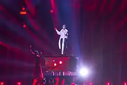 The Belarusian performance featured Alekseev wearing a white shirt and black trousers, performing on stage together with a ballet dancer who wore a full length red Flamenco inspired dress.[21][22] The performance began with Alekseev on a platform while singing to a red rose which he then presented to the camera. The rose was then handed to the dancer who fired it back through Alekseev's hand with a bow. The platform was later raised up from the stage, and was concluded with Alekseev turning his back showing a rose injury.[22][23] The dancer that joined Alekseev was Yulia Zima-Blazhkiv, while the singer was also joined by four off-stage backing vocalists: Anna Kilchenko, Anyanya Udongwo, Valeriya Khomenko and Vilen Kilchenko.[24][25]