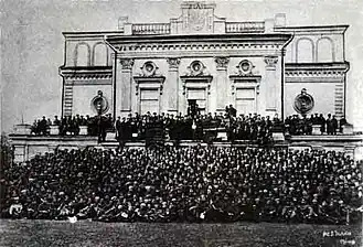 At the same time when this congress was held, numerous other congresses of the Belarusian military took place. For example, at the end of November there was a congress of the 3rd Corps of the Western Front, and on 1–4 December there was a congress of the 2nd Army in Nevel.[12] On 3 December, a congress of Belarusians of the Romanian Front was held in Odessa.[13] Between 15 and 20 December, a congress of soldiers of the Southwestern Front was held in Kyiv.[14] At the same time, congresses of military districts were held. In Smolensk a congress of Belarusian soldiers was held.[15] There were also numerous gatherings in military units.