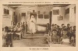 The educational system was dominated by the Catholic Church—as was the case for the rest of Belgium at the time—and, in some rare cases, by Protestant churches. Curricula reflected Christian and Western values. Even in 1948, 99.6% of educational facilities were run by Christian missions. Indigenous schooling was mainly religious and vocational. Children received basic education such as learning how to read, write and some mathematics. The Belgian Congo was one of the few African colonies in which local languages (Kikongo, Lingala, Tshiluba and Swahili) were taught at primary school. Even so, language policies and colonial domination often went hand in hand, as evidenced by the preference given to Lingala—a semi-artificial language spread through its common use in the Force Publique—over more local (but also more ancient) indigenous languages such as Lomongo and others.[65] In 1940 the schooling rates of children between 6 and 14 years old was 12%, reaching 37% in 1954, one of the highest rates in sub-Saharan Africa. Secondary and higher education for the indigenous population were not developed until relatively late in the colonial period. Black children, in small numbers, began to be admitted to European secondary schools from 1950 onward. The first university in the Belgian Congo, the Catholic Jesuit Lovanium University, near Léopoldville, opened its doors to black and white students in 1954. Before the foundation of the Lovanium, the Catholic University of Louvain already operated multiple institutes for higher education in the Belgian Congo. The Fomulac (Fondation médicale de l'université de Louvain au Congo), was founded in 1926, with the goal of forming Congolese medical personnel and researchers specialized in tropical medicine. In 1932 the Catholic University of Louvain founded the Cadulac (Centres agronomiques de l'université de Louvain au Congo) in Kisantu. Cadulac was specialized in agricultural sciences and formed the basis for what was later to become Lovanium University.[66] In 1956 a state university was founded in Elisabethville. Progress was slow though; until the end of the 1950s, no Congolese had been promoted beyond the rank of non-commissioned officer in the Force Publique, nor to a responsible position in the administration (such as head of bureau or territorial administrator).