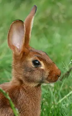 The Belgian Hare is a "fancy" (i.e., it is primarily for exhibition, not meat, fur or fiber) breed of domestic rabbit. It has been selectively bred to resemble the wild European hare,[1] but nevertheless, it is a rabbit rather than a true hare. Averaging 6–9 pounds (2.7–4.1 kg), the Belgian Hare is known for its slender and wiry frame and its long and powerful legs. The breed is responsible for launching the domestic rabbit industry, as well as popularizing rabbit shows in the United States.[2]