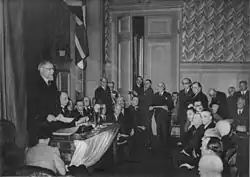 In September 1941, the Belgian government signed the Atlantic Charter in London alongside other governments in exile, presenting the common goals which the Allies sought to achieve after the war.[34] A year later, the government signed the Declaration by United Nations in January 1942, with 26 other nations, which would set a precedent for the founding of the United Nations Organisation in 1945.[35]