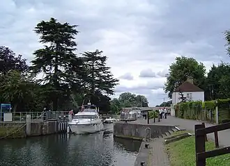 Bell Weir Lock is a lock on the River Thames in England by the right bank, Runnymede which is a water meadow associated with Egham of importance for the constitutional Magna Carta. It is upstream of the terrace of a hotel and the a bridge designed by Edwin Lutyens who designed an ornamental park gate house along the reach. The bridge has been widened and carries the M25 and A30 road across the river in a single span. The lock was first built by the Thames Navigation Commission in 1817; it has one weir which is upstream. The lock is the eighth lowest of forty-five on the river and is named after the founder of the forerunner of the adjoining hotel who took charge of the lock and weir on its construction.