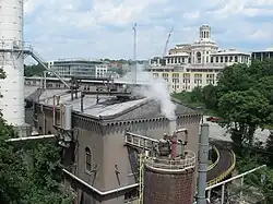 During its coal burning years, the plant could consume up to a 70-ton hopper car of coal per day, delivered by the Pittsburgh Junction Railroad (now in the P&W Subdivision of CSX) that ran through Junction Hollow next to the plant. The plant's small 1942 Plymouth DE 25T locomotive[3] would shuttle the cars between the siding and the plant via a wooden trestle bridge[4] (demolished 2012) spanning Boundary Street.