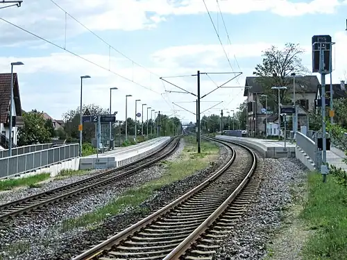 Deutsche Bundesbahn (DB), which was responsible for railway operations from 1949, assigned the station to the railway division of Mainz, which was responsible for all railway lines within the newly created state of Rhineland-Palatinate.[13] In the course of the staged dissolution of the railway division of Mainz from 1 August 1971, its counterpart in Karlsruhe took responsibility for the station.[14] The station had been downgraded to a halt in the 1990s. The station became part of the Karlsruhe Stadtbahn in 2010. This involved the replacement of the island platform by a side platform.