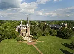 Belmont Abbey College was founded in 1876 as St. Mary's College by Benedictine monks from Saint Vincent Archabbey in Pennsylvania.[5] Father Jeremiah O'Connell purchased Caldwell farm and donated the land to the Benedictines, hoping the community would found a Catholic educational institution in the Carolinas.[6] On April 21, 1876, Father Herman Wolfe, from Saint Vincent, arrived with two students to take possession of the property and begin classes. In 1878, the college held its first commencement exercises. Katharine Drexel, a benefactor of the monastery and college, visited Belmont Abbey in 1904. The present name of the college was adopted in 1913.