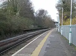 Belmont railway station serves the village of Belmont in the London Borough of Sutton in south London. The station is located on the Epsom Downs line and is in Travelcard Zone 5. It is 16 miles 1 chain (16.01 miles, 25.77 km) down the line from London Bridge measured via West Croydon.[3] It is the closest station to the Royal Marsden Hospital, which is just under half a mile away. On 19 January 2023, Sutton Council were granted £14,121,979 from the government to add a turnback siding to the south of the station to increase capacity to let services run at 4 tph instead of the current 2 tph service pattern.[4][5]