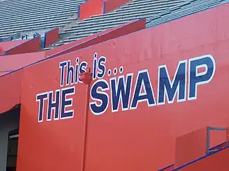 - Painted on the four corners of the stadium are large messages "This is . . . THE SWAMP" (previously read ". . . FLORIDA FIELD" before the mid-1990s), "This is . . . GATOR COUNTRY", the SEC Championship winning years, and the national championship winning years (updated before the 2017 season). Before that season, two of the corners had messages stating "Home of the . . . FLORIDA GATORS" (previously read " . . . FIGHTIN' GATORS" during the 1990s) and "It's Great To Be A FLORIDA GATOR" (before the 2013 season).