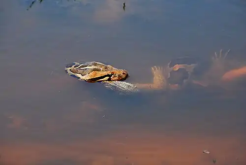 Bengal monitors also scavenge carrion and sometimes congregate when feeding on large carcasses such as that of deer.[24] In areas where livestock are common, they often seek out dung to forage for beetles and other insects.[25][26]