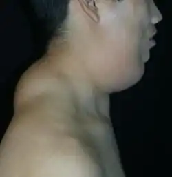 Cosmetic disfigurement due to the fat deposition in the cervicothoracic region results in a "pseudoathletic appearance," resembling the Italian statue Warrior of Capestrano and carvings of Queen of Punt (Egypt).[10][17] The fat deposited around the front of the neck is known as Madelung's collar or horse collar.[13][5] Fat deposited on the back of the neck between the shoulder blades is known as a dorsocervical fat pad or buffalo hump.[13][18] Fat deposited in the parotid region is known as hamster cheeks.[10]