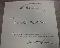On February 15, 1932, President Herbert Hoover nominated Cardozo as an associate justice of the United States Supreme Court,[21] to succeed Oliver Wendell Holmes. The New York Times said of Cardozo's appointment that "seldom, if ever, in the history of the Court has an appointment been so universally commended."[22] The Democrat Cardozo's appointment by a Republican president has been referred to as one of the few Supreme Court appointments in history that was not motivated by partisanship or politics, but strictly based on the nominee's contribution to law.[23]