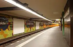 As with other new Berlin U-Bahn buildings of the time, the architect Rainer Gerhard Rümmler was responsible for the visual design.[4] The result was decorated with colorful floral motifs fired on ceramic tiles.