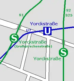 The adjacent Yorckstraße U-Bahn station of the U7 was built in 1971 by R.G. Rümmler. The underground station has two exits one each to one of the two S-Bahn stations, which are otherwise only connected by a short walk or (in the eastward direction) by bus. The next underground station in eastward direction is Möckernbrücke, where transfer is available to U1.[4]