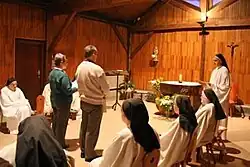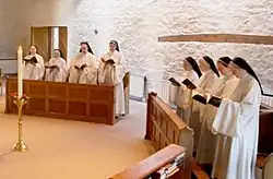 Liturgical and personal prayer is at the heart of the life of the Bernardine Cistercians. The sisters meet five times daily for the offices of Lauds (morning prayer) Terce (at about 9 a.m) Midday Prayer, Vespers (Evening prayer) and Vigils before retiring. The last office of the day, Vigils, combines both the elements of traditional Vigils, (night watching in the hope of the coming day) and Compline (thanking God for the day that has passed and praying for a peaceful night.) The office of Vigils ends with the singing of the Salve Regina by candlelight.