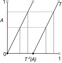 The resulting is a real number in the unit interval The shift induces a homomorphism, also called , on the unit interval. Since one can see that This map is called the dyadic transformation; for the doubly-infinite sequence of bits the induced homomorphism is the Baker's map.