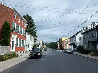 Main Street was laid out in 1819 and has numerous buildings dating back to the nineteenth century, including the Cyrus G. Blatt home (501-503 N. Main), the Eagle Hotel (301 N. Main) and the Joseph B. Conrad home (219 N. Main).[10] Main Street is also the location of both churches: St. Thomas's UCC, and Evangelical Lutheran Friedens Church. The churches are located across the street from each other.