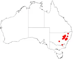 This species of Bertya grows in a variety of drier habitats, including forest, woodland and open mallee in central New South Wales, mainly between Narrabri, Moonbi, Kandos and the Warrumbungles.[2][4]