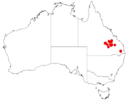 This species of Bertya confined to south-east Queensland, where the subspecies have disjunct distributions.[2] Subspecies brevifolia grows in open forest or woodland on shallow sandy soil on sandstone outcrops in the Carnarvon and Expedition Ranges in central Queensland, but subsp. lapicola grows in open forest communities and is confined to sandstone hills north of Helidon in south-east Queensland.[2]