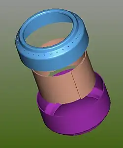 The basic design dates back more than a century.[2] It consists of a double-wall gas generator, a perforated burner ring, and an inner preheat chamber. A similar design was patented in 1904 by New York coppersmith J. Heinrichs.[3] Trangia has been selling a commercial version of the design since 1925, and Safesport marketed a stainless-steel stove in the 1990s. The Trangia stove burner is made from brass, although all the other associated parts that come with it are aluminium.