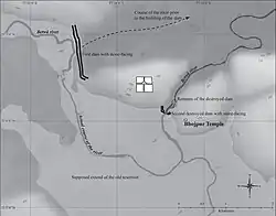 The dams were constructed of cyclopean masonry on a massive scale. The dam to the north is preserved, but the one immediately below the temple was knocked down by an exceptional Monsoon surge in the mid-eleventh century.[1] A myth about the Bhojpur dams has emerged thanks to the writing of William Kincaid.[2] He mis-interpreted an account in a Persian chronicle (recording that a dam was opened on the orders of Hoshang Shah of Malwa), as referring to Bhojpur, an idea elaborated by U. N. Day in 1965 and repeated in the subsequent years.[3] The account, translated by U. N. Day from Persian, states that the king pulled down a dam at the request of local merchants in Bhopal and Vidisha whose caravans were being raided by bandits who would take refuge at an inaccessible spot protected by the lake. This account refers to the Bhojtal at Bhopal where even today an island in the middle of the lake can be seen. The dam at Bhopal was subsequently repaired and further raised when the Kamlapati Palace was constructed in the eighteenth century.