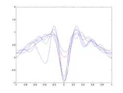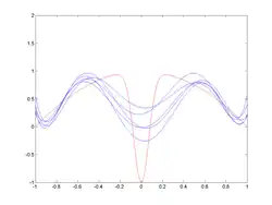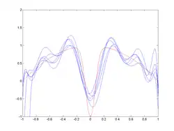 It is an often made fallacy[3][4] to assume that complex models must have high variance. High variance models are "complex" in some sense, but the reverse needs not be true.[5] In addition, one has to be careful how to define complexity. In particular, the number of parameters used to describe the model is a poor measure of complexity. This is illustrated by an example adapted from:[6] The model has only two parameters () but it can interpolate any number of points by oscillating with a high enough frequency, resulting in both a high bias and high variance.