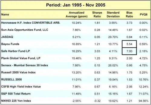 Serial correlations appear in many cases that are likely not the result of willful manipulation but rather the result of stale prices and illiquid assets. Both Sun Asia and Plank are emerging market hedge funds for which the author has full transparency and whose NAVs are based on objective prices. However, both funds show significant serial correlation. The presence of serial correlation in several market indices such as the JASDAQ and the SENSEX argues further that serial correlation might be too blunt a tool for uncovering manipulation. However the two admitted frauds, namely Bayou, an Equity fund and Safe Harbor, an MBS fund (Table IV shows the critical bias ratios values for these strategies) are uniquely flagged by the bias ratio in this sample set with none of the problems of false positives suffered by the serial correlation metric. The bias ratio's unremarkable values for market indices, adds further credence to its effectiveness in detecting fraud.