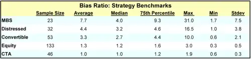 Strategies that employ illiquid assets can have bias ratios with an order of magnitude significantly higher than the bias ratios of indices representing the underlying asset class. For example, most equity indices have bias ratios falling between 1.0 and 1.5. A sample of equity hedge funds may have bias ratios ranging from 0.3 to 3.0 with an average of 1.29 and standard deviation of 0.5. On the other hand, the Lehman Aggregate MBS Index had a bias ratio of 2.16, while MBS hedge funds may have bias ratios from a respectable 1.7 to an astounding 31.0, with an average of 7.7 and standard deviation of 7.5.