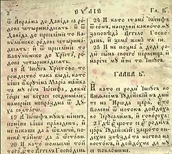 In 1852 Pavel Bozhigrobski printed the first four pages of the Konikovo Gospel in Solun.[10] In the original the language was not named, but in the version published by Bozhigrobski he calls it "Bulgarian".[11][12][13][5] The printed version was republished in transcription in 1917, 1922 and 1931 by Bulgarian researchers.