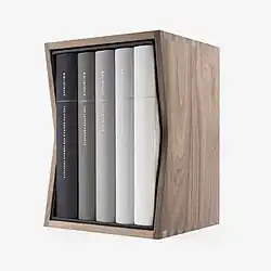 Bibliotheca is a five-volume[1] version of the Bible created by Adam Lewis Greene[2] published in 2016. It was funded in mid 2014 through a thirty-day Kickstarter campaign for which Greene set a goal of $37,000, but the campaign raised over $1.4 million.[3] Greene's aim, as detailed in his Kickstarter campaign video,[4] was to enhance the experience of reading biblical literature by giving the content a more novel-like form, omitting chapter and verse numbers and annotation, utilizing a sewn binding and opaque book paper (rather than Bible paper), and creating original typefaces optimized for legibility, among other features.[5][6]