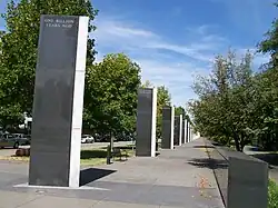The eastern outer path is the Walkway of Counties, which represents the state's geography from east to west. The planters next to the walkway highlight the state's diverse topographical landforms, and feature flora from across the state's respective regions.[7] Accompanying these are granite obelisks which provide descriptions of the state's nine physiographic regions. An obelisk detailing the history of the Tennessee State Capitol is also located along here.[8]