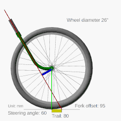 Trail is a function of steering axis angle, fork offset, and wheel size. Their relationship can be described by this formula:[16]